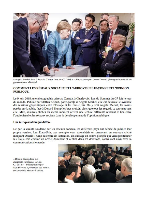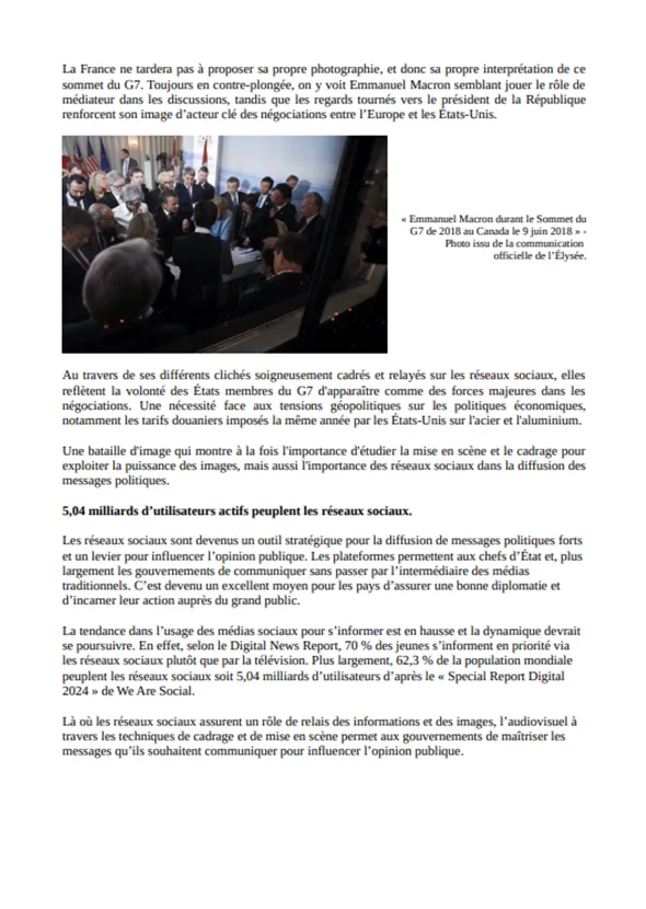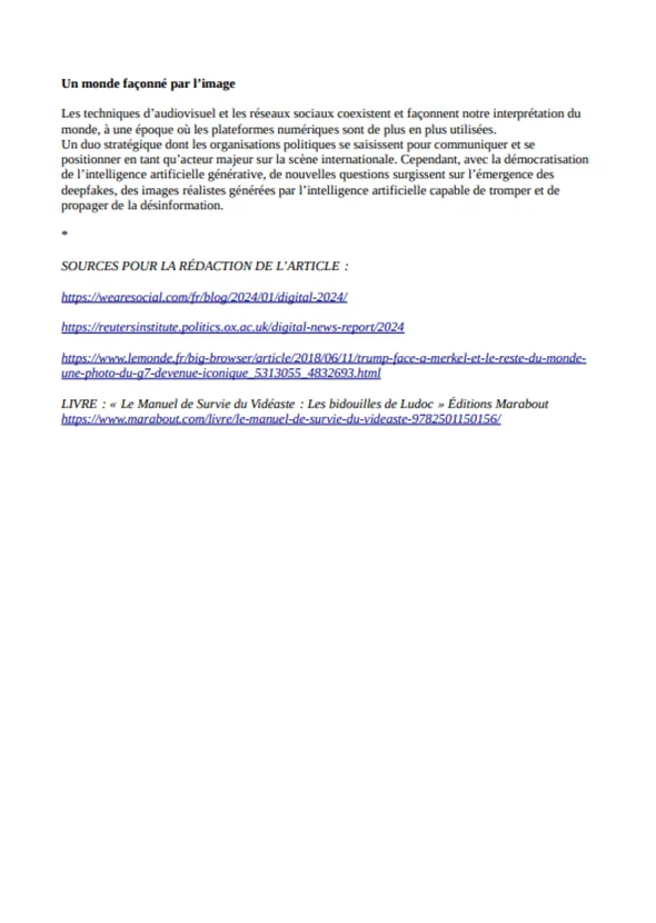 Pour pouvoir intégrer la formation de Mastère 1 à l’IFSJ, avec une remise à niveau, j’ai dû rédiger un article de style journalistique sur un sujet de mon choix. Ce sujet portait sur le lien étroit entre l’usage des codes de l’audiovisuel (plans, angles de vue) et les réseaux sociaux, pour influencer l’opinion publique et leur rôle dans la politique étrangère.