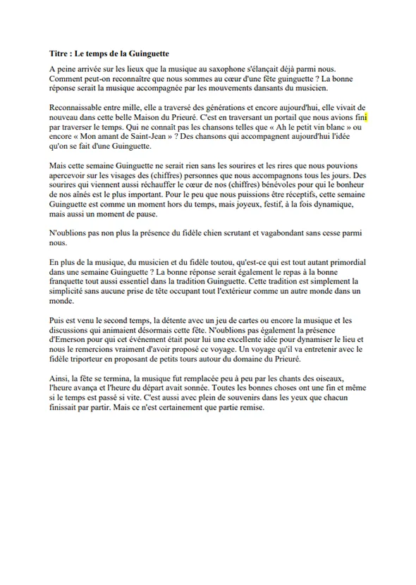 En lien avec mon stage de première année de BTS Communication chez les Petits Frères des Pauvres. L’objectif était d’écrire un article sur l’événement « Guinguette », qui s’est déroulé du 19 au 23 juin 2023, pour le magazine FORUM.